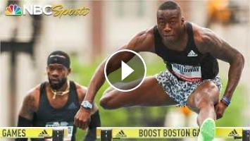 With his mentor and current world record holder Aeries Merritt in the race, Grant Holloway comes within .04 of Merritt's world record time to win the men's 110m hurdles at the Adidas Boost Boston Games in 13.20. #GrantHolloway #TrackandField
