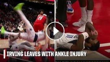 Dwight Powell lands on Kyrie Irving's ankle after mix up during the Dallas Mavericks vs. Portland Trail Blazers matchup. Irving would sink both free throws and exit the game.