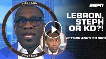 On First Take, Stephen A. Smith and Shannon Sharpe debate which NBA star is most likely to win one more title between LeBron James, Steph Curry and Kevin Durant.