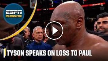 Mike Tyson reacts to his loss to Jake Paul in Dallas, Texas at AT&T Stadium and jokingly call out Jake's brother, WWE superstar Logan, in the process.