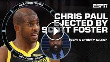 Malika Andrews, Chiney Ogwumike and Kendrick Perkins react to Chris Paul receiving a pair of technical fouls from referee Scott Foster and being ejected just before halftime between the Golden State Warriors and Phoenix Suns.