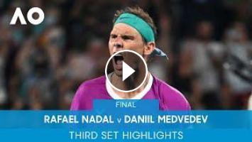 Watch highlights of the 3rd set of the men's Australian Open 2022 final, as Rafael Nadal takes on Daniil Medvedev to see who will be crowned champion.