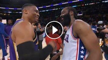Russell Westbrook and James Harden share a laugh after Lakers vs 76ers