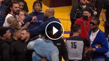 After the halftime buzzer, Shannon Sharpe and Tee Morant have to be separated by both referees and security, along with members of the Grizzlies bench.