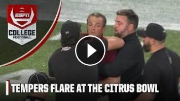 During a break in play at the Cheez-It Citrus Bowl, due to an injury for an Illinois defender, South Carolina head coach Shane Beamer becomes upset after Fighting Illini head coach Bret Bielema appears to taunt him on the field.