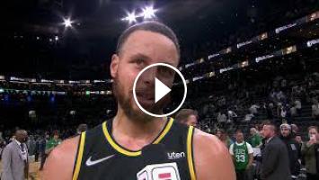 Stephen Curry fields questions following the Golden State Warriors' Game 4 win in the 2022 NBA Finals over the Boston Celtics. The series is now tied at 2 games a piece.
