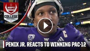 ESPN’s Holly Rowe interviews Washington’s Michael Penix Jr. and Dillon Johnson following the Huskies’ 34-31 win against Oregon in the Pac-12 Championship Game. Head coach Kalen DeBoer speaks about the camaraderie between his player and effort they put forth to remain undefeated.